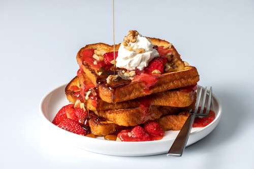 Top warm french toast with a drizzle of warm strawberry syrup, a dollop of whipped mascarpone, and a handful of remaining strawberries.
